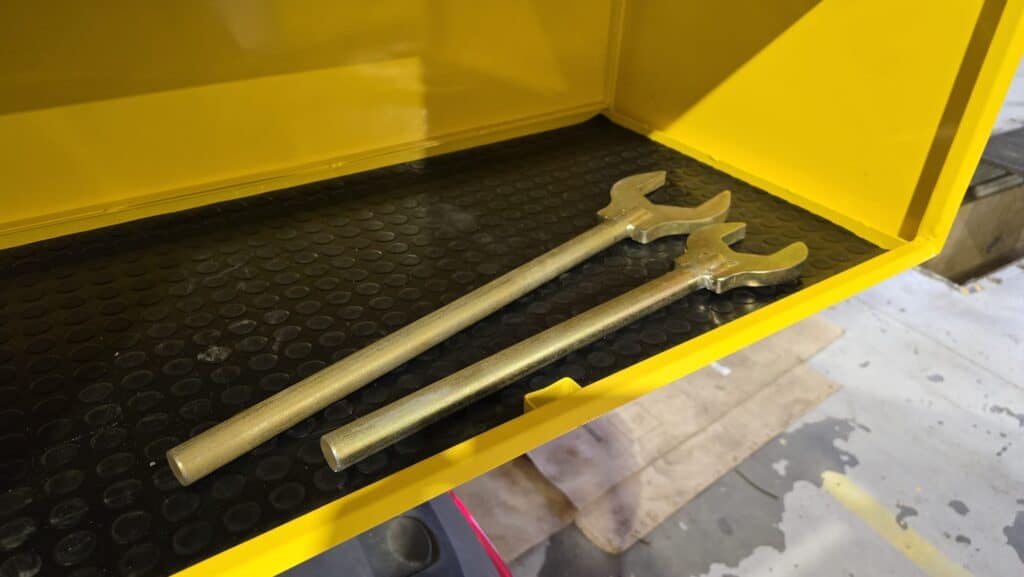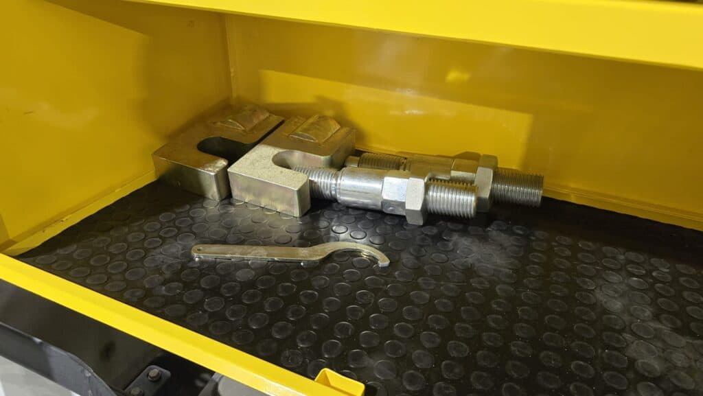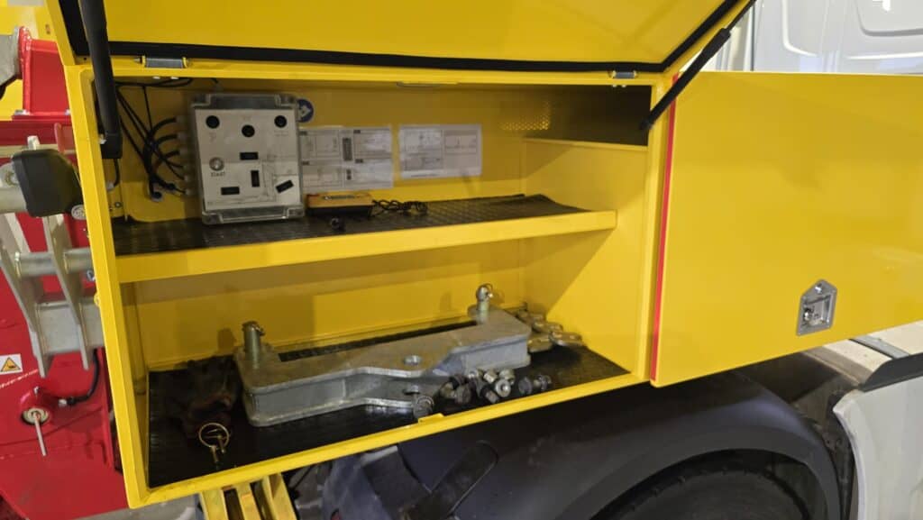 Påbyggnaden har en oberoende 24V DC-strömförsörjning, ett hydraulkraftaggregat med fördelare och styrningen av armen sker med en trådlös fjärrkontroll eller via en kontrollpanel i skåpet.